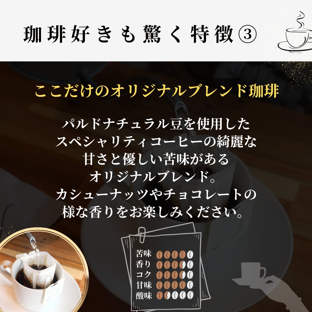 オリジナルブレンドでお楽しみいただけるのは、ブラジル・サルト農園のパルドナチュラル豆を使用したスペシャルティコーヒーです。綺麗な甘さと優しい苦味の調和と、カシュナッツやチョコレートのような香りをお楽しみください。